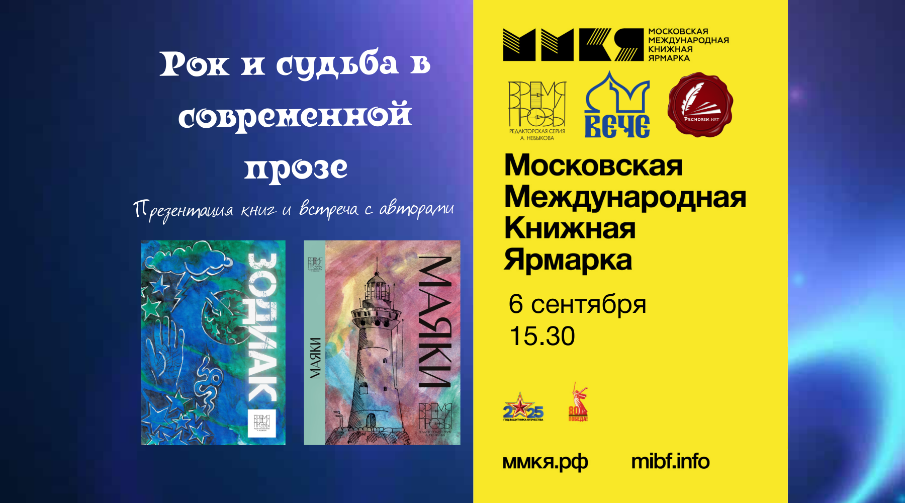 В рамках Московской международной книжной ярмарки будет представлен второй сборник малой прозы «Зодиак» редакторской серии Алексея Небыкова «Время прозы» издательства «Вече». Читатели узнают о роке и судьбе в произведениях современных прозаиков, увидят полноразмерные картины-иллюстрации новой книги, узнают о новом отборе произведений в книги серии.