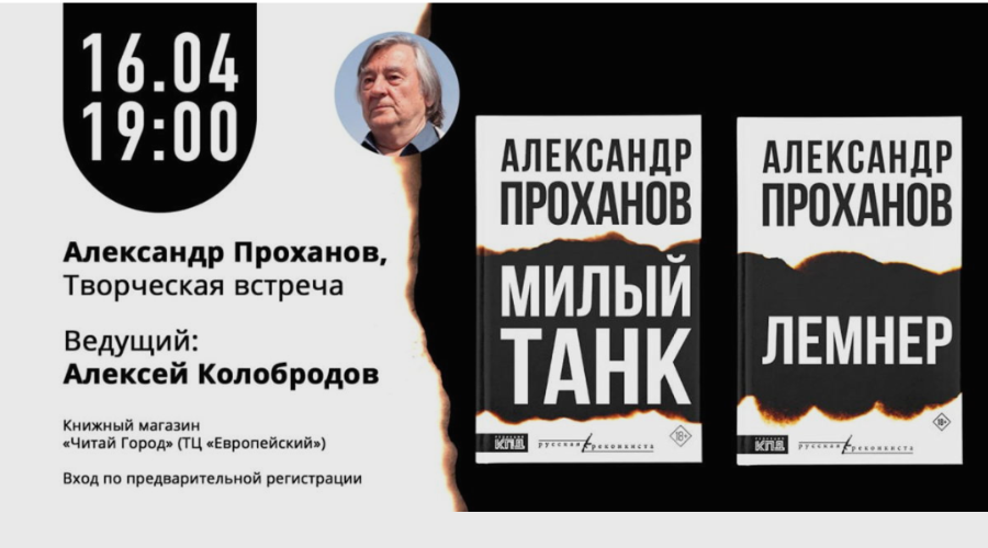 16 апреля в 19.00 в книжном магазине «Читай-город» в торговом центре «Европейский» по адресу: Москва, пл. Киевского Вокзала, д.2 состоится творческая встреча с Александром Прохановым.